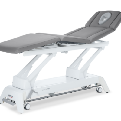Table de massage électrique 3 plans, grand dossier, têtière avec accoudoirs, découpe faciale Ergomax et coussin d’obturation.